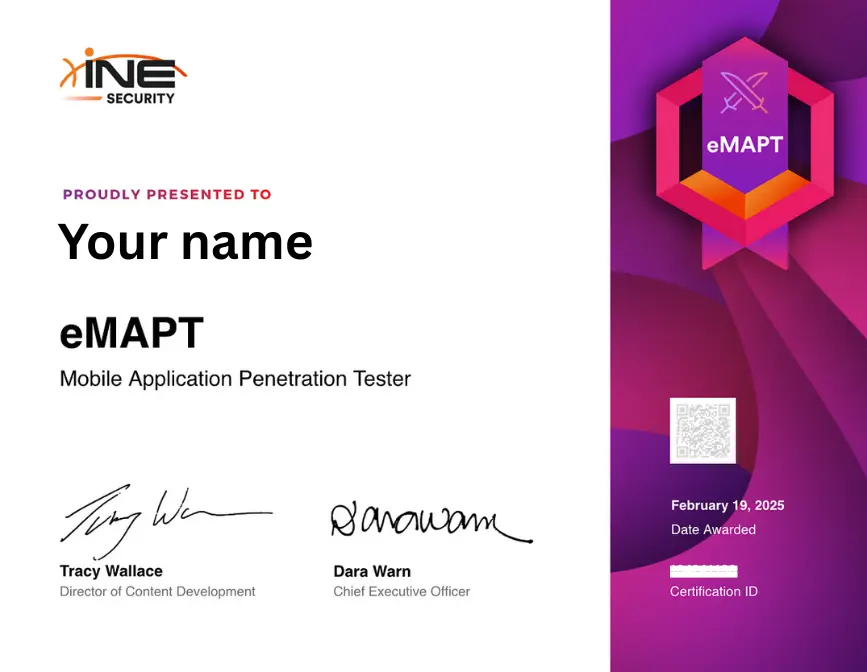Certification Name: eLearnSecurity Mobile Application Penetration Tester (eMAPT)